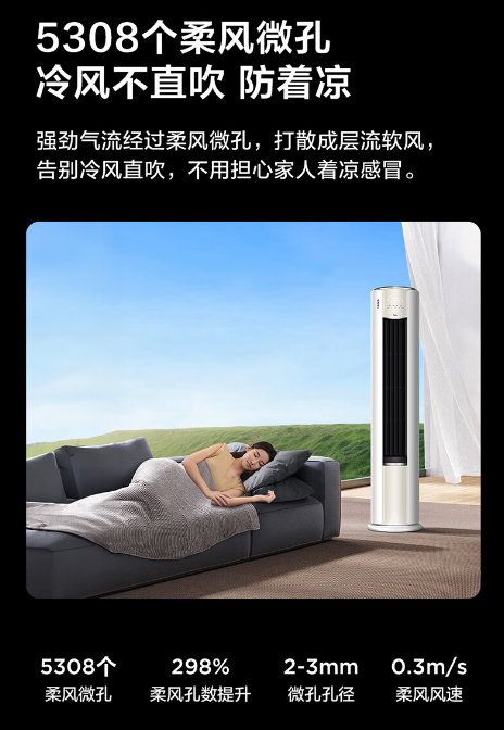 在柔風模式的設計上,TCL真省電Pro柜機采用5308個智慧柔風微孔,確保強勁冷風在經過時能夠被有效打散。經過微孔過濾和分散,原本剛勁的氣流被轉化為層流軟風,柔和而舒適,宛如自然微風般拂過肌膚,避免冷風直吹帶來不適感。