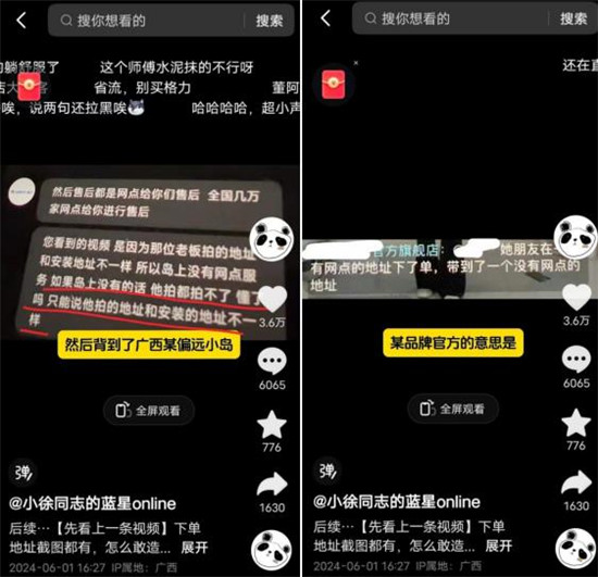 5月31日,該用戶的第一條視頻發(fā)出。視頻中介紹了半個月的時間里,用戶提出基礎(chǔ)的安裝訴求后,遇到的每一個“拒絕式反饋”。該用戶稱,下單時地址在服務范圍內(nèi),但到貨后卻又不在服務范圍內(nèi),為享受安裝服務要另外付上島費和船費(后續(xù)提到約400元)。自己想另找安裝師傅又面臨沒有開機密碼的窘境。