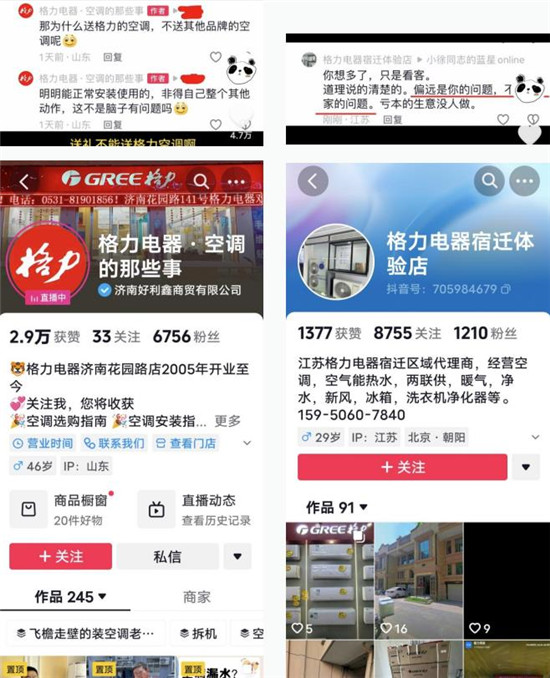 至此,整個事件中最離譜環(huán)節(jié)才剛剛到來,有ID為“格力電器·空調(diào)那些事”的抖音用戶稱發(fā)布該視頻的用戶“腦子有問題”;ID為“格力電器宿遷體驗店”指責視頻作者“偏遠是你的問題,不是商家的問題”……