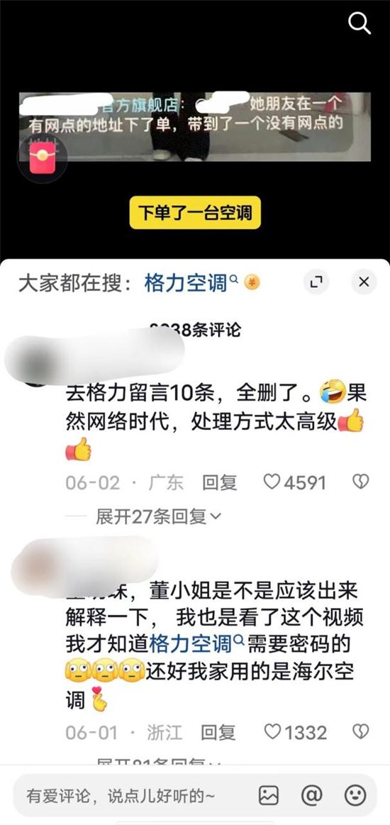 至此,格力犯下的服務錯誤已經(jīng)包括但不限于:1、格力銷售范圍超出安裝范圍;2、格力客服“踢皮球”不解決問題;3、格力疑似暗示用戶撒謊以推卸責任;4、格力疑似鎖區(qū)修改配送范圍;5、格力疑似刪除相關(guān)評論并在直播間禁言“廣西小島”6、格力多收用戶退貨費并且拖延退款……