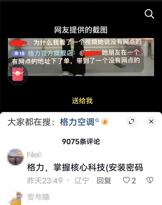 之后,評論區(qū)有網(wǎng)友稱前往格力的一些官方途徑包括直播間等詢問該事件,格力方面聲稱是網(wǎng)友的下單地址和安裝地址不一樣才導致,并表示用戶朋友是在有網(wǎng)點的地址(北京)下單,帶到了沒有網(wǎng)點的地址(廣西某島)尋求安裝,從北京到廣西,格力的解釋讓事件更加荒誕。