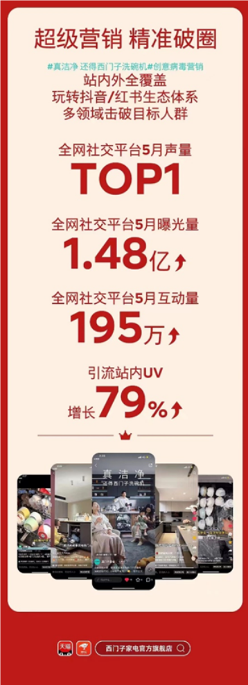 在線上,西門子洗碗機成功發(fā)布了618營銷活動,發(fā)起#真潔凈,還得是西門子家電#的社交媒體話題討論,通過大數(shù)據(jù)分析精準(zhǔn)定位目標(biāo)消費群體,深刻挖掘消費者日常生活中的真實洗碗痛點,通過在小紅書和抖音平臺創(chuàng)造了一系列富有創(chuàng)意且貼合中國消費者日常生活的視頻與圖文內(nèi)容。這些內(nèi)容在社交媒體上廣泛傳播,不僅提升了品牌曝光度,還實現(xiàn)了與消費者的深度互動。在活動期間引流站內(nèi)UV增長79%,全網(wǎng)社交媒體平臺5月曝光量1.48億,以互動量195萬達到5月社交媒體平臺聲量第一,成功將品牌信息有效觸達至更廣泛的潛在用戶群體,進一步加深了消費者對西門子洗碗機潔凈技術(shù)的認知。