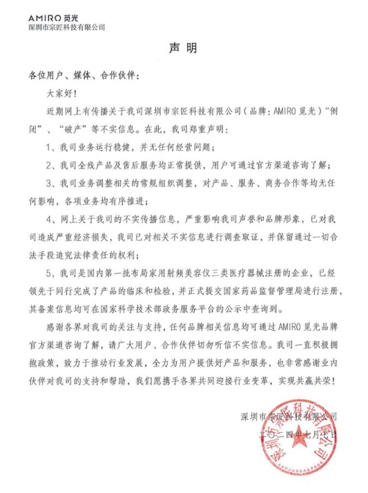 就在外界紛紛猜測AMIRO覓光是否即倒下之際,公司方面給出了回應。相關負責人緊急辟謠,堅稱“覓光倒閉”為不實信息,聲稱公司正在進行正常的業(yè)務調整,目前運營狀況良好,各項業(yè)務都在穩(wěn)步推進中。他們承諾將繼續(xù)為消費者提供高品質的產品和服務,力圖挽回消費者的信心。