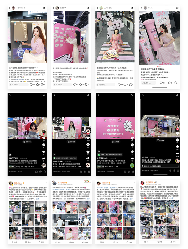 SAKURA櫻花以品牌態度先聲奪人,多平臺發布聯名懸念海報、倒計時海報,為活動預熱蓄水,給足消費者對聯名IP的期待與關注。一經發布,社媒平臺超50家品牌聯動轉發,線上閱讀量合計超百萬,同時聯合達人曝光主題店活動,實現聲量全面爆發。全國門店聯動,發布門店創意海報,引導線上流量下探線下,跨界多渠道引流,吸引大批“不二兔”漫粉,拓寬了目標市場,用有溫度的品牌態度深入連接了用戶。