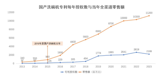 回顧最近十年,中國洗碗機市場每年新增專利授權數量與全渠道零售額呈現了同頻上升的趨勢。專利授權數的增加,反映了本土頭部品牌對于技術創新的高度重視,這些新技術、新功能為市場下一次“起跳”積累了強大的動能。