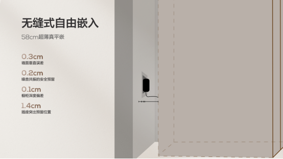 按照國(guó)際櫥柜標(biāo)準(zhǔn),櫥柜進(jìn)深一般為60cm,假如冰箱厚度大于這個(gè)數(shù)據(jù),則難以完美平嵌入櫥柜。然而,雙系統(tǒng)冰箱由于搭載了兩個(gè)蒸發(fā)器,一般體積較大,而TCL冰箱在擁有雙蒸發(fā)器的情況下,基于140μm微孔發(fā)泡技術(shù),竟將機(jī)身厚度控制在了極致的58cm。多出的2cm空間,用于解決插座凸出、墻體垂直誤差、櫥柜深度偏差、噪音共振安全距離等安裝問(wèn)題,實(shí)現(xiàn)“真平嵌”。與此同時(shí),平穩(wěn)嵌入式鉸鏈保證即使冰箱貼墻放置,冰箱門(mén)也能開(kāi)啟至90°,抽屜正常打開(kāi)。底部散熱設(shè)計(jì)則讓冰箱有了0cm無(wú)縫嵌入的條件,左右無(wú)需留出縫隙,在節(jié)省空間的同時(shí)避免灰塵堆積。