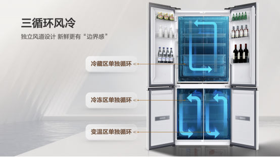 此外,TCL還在T9 Pro的冷藏室、冷凍室、變溫室內(nèi)置獨(dú)立的風(fēng)道設(shè)計(jì),分別形成單獨(dú)的冷氣循環(huán)回路。與普通的單循環(huán)冰箱相比,三風(fēng)道的獨(dú)立運(yùn)作,避免了一個(gè)出風(fēng)口導(dǎo)致不同艙室空氣混雜、氣味和細(xì)菌亂竄的情況,使艙室之間空氣循環(huán)不互通、氣味不混雜、細(xì)菌不亂竄,正如“源頭活水、生生不息”的道理,使冰箱內(nèi)的空氣持續(xù)流通,最大程度保證了食材的新鮮度。