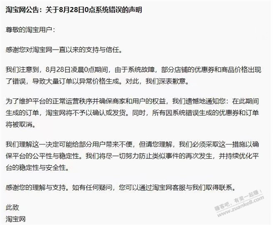 在接近早晨的時候,淘寶終于發出了相關聲明,稱0點的BUG價為系統錯誤,并且再次期間生成的訂單不予確認或發貨,同時相關優惠券和訂單也將被取消。