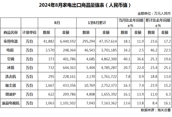8月出口冰箱732萬臺,同比增長20.7%;1-8月累計出口5,404萬臺,同比增長23.4%。