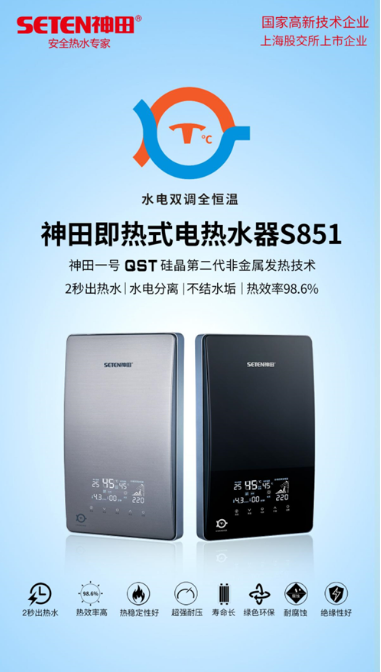 神田S851采用的是神田一號QST硅晶非金屬發熱技術,水電分離,不結水垢,2秒出熱水,熱效率高達98.6%。面板采用超跑車的溜背式設計,超大寬屏LED熒光白屏,觸摸感應按鍵,科技感與時尚感完美融合。