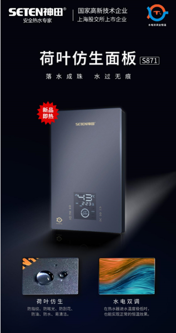 黃建岳表示,S871除了應用水電雙調全恒溫技術以外,面板采用了行業內領先的何葉仿生玻璃面板,滴水成珠,水過無痕,防指紋,防眩光,防刮花,防油,防水,易清潔,與普通的鋼化玻璃面板相比,荷葉仿生玻璃面板工藝更復雜,成本更高,磨砂質感更強,檔次也更高。神田電器作為行業內新潮流技術的引領者,此次率先應用了荷葉仿生面板,掀起“荷葉仿生面板”新潮流。