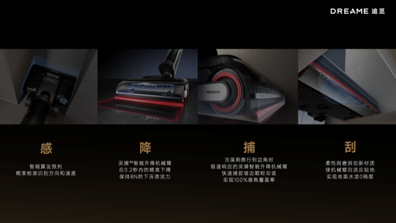 靈捕智能升降機械臂技術解決了兩大用戶痛點。其一,洗地機在滾刷前側如同伸出一只“手”,覆蓋墻角、墻邊等清潔死角,實現100%全向三側0貼邊,有效解決了邊角難清潔問題。其二,解決了地面水漬問題,清潔過后實現0水漬殘留。