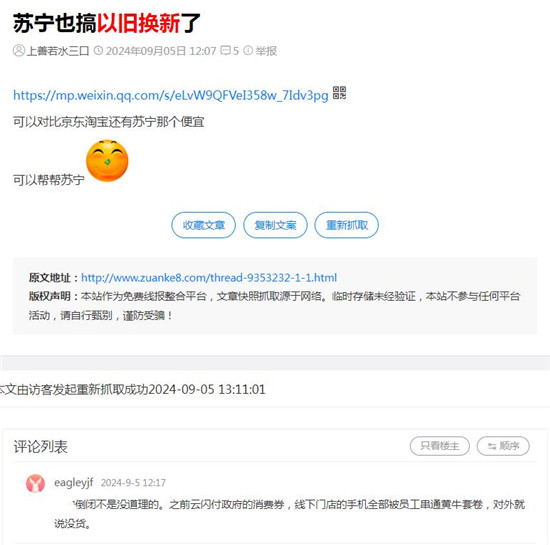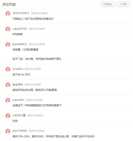 而現在,已經到了9月,以舊換新政策在各省、市基本已經進入落地階段。在抖音、小紅書等大眾化的社交平臺,基于實實在在的價格補貼,以舊換新新動作很快收到了普遍的好評。但是在一些專門的購物類社區,這些對價格極其敏感的受眾們,對于各地以舊換新的舉措其實并不是那么滿意,特別是因為各地落地方式和內容的差異,甚至招致了不少怨言。