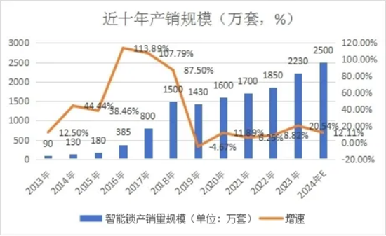 從中國日用五金技術開發中心發布的《2024年全國智能門鎖行業市場調研半年報》來看,近十年來中國智能鎖產銷規模進入穩定增長階段,全球高端智能鎖市場規模也持續增長,市場空間巨大。根據日用五金數據,2023年,全國智能門鎖產銷量達約2230萬套,同比增長12.7%;預計2024年智能門鎖行業產銷量將突破2500萬套。