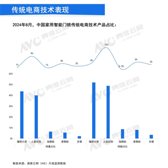 值得一提的是,靜脈識別技術因其高安全性的特點,逐漸成為智能門鎖行業重要的發展趨勢之一。奧維云網也分析中表示,靜脈識別技術對于追求極致安全性的用戶而言,提供了可靠選擇,其市場占比持續增長。奧維云網線上監測數據顯示,2024年1-8月傳統電商靜脈識別智能門鎖零售額占比達到16%,零售量占比達到10%。