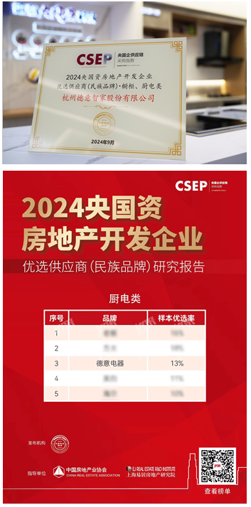 9月28日,由中國(guó)房地產(chǎn)業(yè)協(xié)會(huì)、上海易居房地產(chǎn)研究院指導(dǎo),中房?jī)?yōu)采測(cè)評(píng)的《2024央國(guó)資房地產(chǎn)開發(fā)企業(yè)優(yōu)選供應(yīng)商(民族品牌)研究報(bào)告》在北京隆重發(fā)布。德意電器憑借強(qiáng)大的品牌實(shí)力、出色的產(chǎn)品解決方案以及專業(yè)的工程服務(wù),入選“2024年央國(guó)資房地產(chǎn)開發(fā)企業(yè)優(yōu)選供應(yīng)商(民族品牌)廚電類TOP3”。