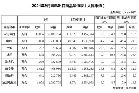 9月出口洗衣機279萬臺,同比持平;1-9月累計出口2,449萬臺,同比增長16.3%。