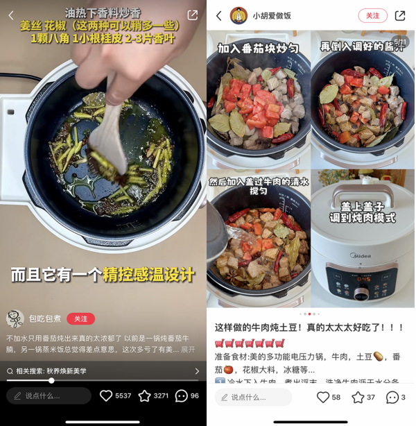 繁忙高壓的生活節(jié)奏下,既能高效出餐又能兼顧美味的「懶人一鍋煮」做飯公式風(fēng)靡小紅書。多位美食博主踩準(zhǔn)時(shí)節(jié)需求,在這波秋季養(yǎng)生風(fēng)潮中用美的多功能電壓力鍋這一廚房里的「養(yǎng)生魔術(shù)師」,為忙碌的脆皮打工人量身推出一系列秋日養(yǎng)生美食教程,化解既要「吃得好」又想「養(yǎng)得好」的精致都市人做飯焦慮,讓每一個(gè)忙碌的靈魂都能在營(yíng)養(yǎng)美味的加持下,為自己快速回血充能。