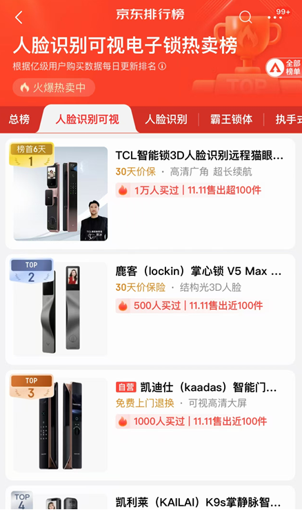 在最近的雙十一人臉識(shí)別智能鎖銷量排行榜中,TCL力壓各大品牌拿下人臉識(shí)別銷量榜第一的寶座,表現(xiàn)非常亮眼。