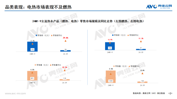 但燃熱、電熱的銷售表現呈現較大差異,奧維云網(AVC)推總數據顯示,2024年1-9月,燃熱市場零售量891萬臺,同期增長4.0%;零售額192億元人民幣,同比增長2.1%。電熱市場零售量1205萬臺,同期增長2.5%;零售額156億元人民幣,同比下滑0.9%。電熱表現不及燃熱,零售額更是呈現負增長。