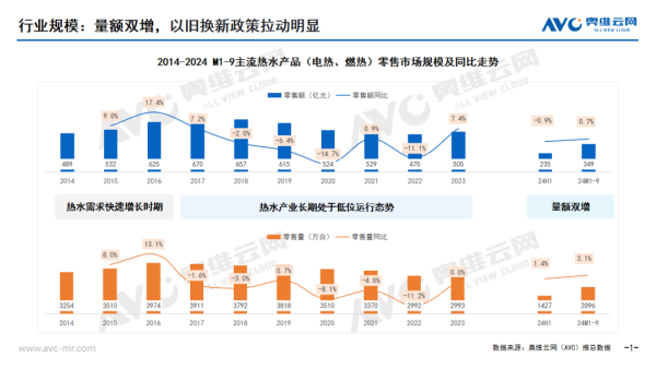 在房地產周期處于下行區間,中國消費者信心指數呈現下降的趨勢下,市場迎來“以舊換新”政策紅利。在政策利好因素的拉動下,熱水行業長期低位運行態勢得以扭轉,量額雙增。奧維云網(AVC)線上推總數據顯示,2024年1-9月,主流熱水器市場(電熱、燃熱)零售量2096萬臺,同比增長3.1%;零售額349億元,同比增長0.7%。9月主流熱水器市場(電熱、燃熱)零售量263萬臺,同比增長15.5%;零售額49億元,同比增長21.3%。