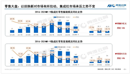 但從市場反饋上,相對于同樣被納入以舊換新八大類的分體煙灶而言,以舊換新似乎對集成灶市場的拉動力不及分體式煙灶。奧維云網(AVC)推總數據顯示,2024年1-9月我國集成灶市場累計零售額、零售量分別為147億元、167萬臺,同比分別下滑20.5%、18.0%。其中9月零售額、零售量分別為23億元、25萬臺,同比分別下滑16%、14%。考慮到集成灶市場的新房剛需不足、換新周期尚未到來,集成灶在本輪以舊換新中很難成為主力品類。