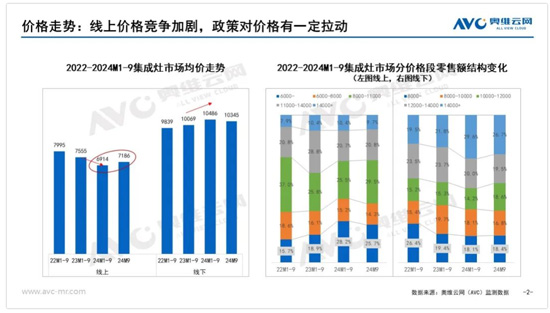 作為單價較高的產品,消費降級對集成灶市場產生了較大沖擊。從價格走勢上看,集成灶線上市場的整體均價在今年有一個比較明顯的下行趨勢。奧維云網(AVC)監測數據顯示,2024年1-9月線上市場均價為6914元,相比去年同期下降超過500元。從價格結構上看,2024年相比2023年同期而言中高端價格段市場份額下降明顯。奧維云網(AVC)監測數據顯示,2024年1-9月線上市場11000+市場份額為31.1%,相比去年同期下降8.1個百分點。以舊換新政策實施后,線上市場均價有一定的回調。