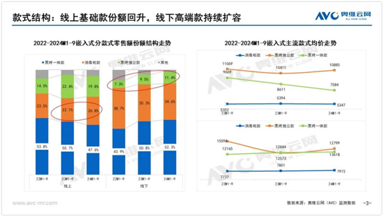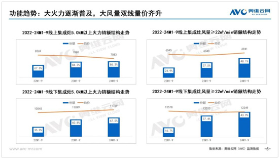 從功能趨勢上看,技術參數的提升依然是現階段集成灶的主要趨勢。這其中在煙灶部分的參數提升最為明顯。奧維云網(AVC)監測數據顯示,2024年1-9月集成灶線上線下市場中5.0kW以上火力份額分別為86.3%、67.5%,普及率已經達到比較高的水平,同時線上溢價能力有限。24年1-9月集成灶線上線下市場中22m³/min以上風量的份額同比分別增長10.6、6.5個百分點,同時均價在雙線也均呈上升趨勢。