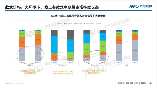 分款式看價格,線上市場各款式的價格有明顯下行趨勢。奧維云網(AVC)監測數據顯示,24年1-9月線上市場消毒柜款6000-的市場份額超過50%,同比增長6.8個百分點。蒸烤一體款向下的價格滲透則更明顯,6000-的市場份額幾乎翻倍提升。其中部分品牌將消毒柜款的價格打到4000元內,將蒸烤一體款的價格打到5000元左右,相對于分體式煙灶消三件套/煙灶烤三件套而言已經幾乎沒有價格上的劣勢。