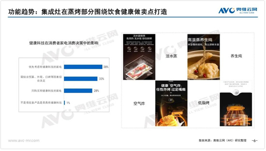 現在的家電市場已經逐漸走向“體驗為王”的時代,價格內卷對用戶固然有吸引力,但是對集成灶來說,從單純追求產品的技術參數轉向提升用戶體驗則更為重要。健康科技在消費者對家電的消費決策中的影響力越來越大,集成灶企業圍繞蒸烤部分通過以健康作為主要賣點,提升用戶體驗,不斷對產品進行迭代。蒸烤一體款、蒸烤獨立款的空氣炸、活水蒸、低脂烤、養生燉,消毒柜款的四星級消毒等針對飲食健康的產品趨勢逐漸成為主流。