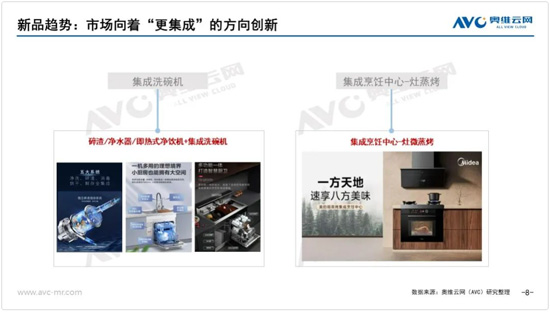 從市場趨勢上看,產品形態“1+1=1”的廚電集成化的趨勢不變,集成洗碗機和集成烹飪中心作為集成新品類的代表,在產品功能上持續做拓展。集成洗碗機+垃圾處理器、集成洗碗機+凈水器、集成洗碗機+凈飲機、灶微蒸烤集成烹飪中心…市場持續向更集成的方向創新。