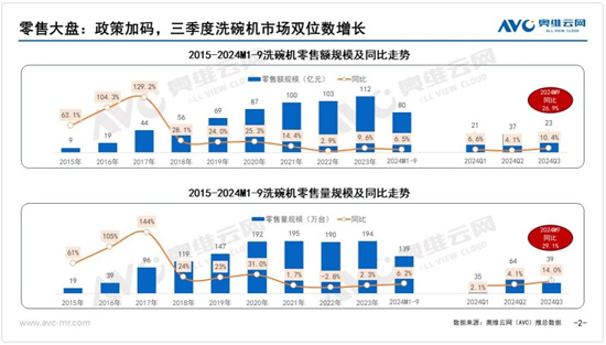 隨著消費者對于品質生活追求的不斷升級,洗碗機逐漸受到中國家庭的喜愛。但當前,房地產市場調整、居民消費意愿變化等因素制約了國內洗碗機市場的快速增長。以舊換新政策中,洗碗機入圍了不少地方的補貼名單,“以舊換新”政策成為了推動市場復蘇的重要力量。奧維云網(AVC)推總數據顯示,2024年1月-9月洗碗機市場零售額規模80億元,同比增長6.5%;零售量規模139萬臺,同比增長6.2%。其中9月,洗碗機市場零售額規模11億元,同比增長26.9%;零售量規模17萬臺,同比增長29.1%。