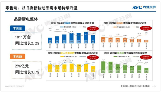 伴隨國家以舊換新政策的持續推進,消洗嵌凈四大品需品類進入了多地的以舊換新名單,2024年Q3廚衛品需品類(洗碗機、消毒柜、嵌入式微蒸烤、凈水器)市場呈現明顯的上行態勢。奧維云網(AVC)推總數據顯示,品需廚電前三季度累計零售額為296億元,同比增長3.7%;從換新效果看,9月四大品需品類同比增速均超過15%,其中洗碗機和凈水器市場同比增速超過25%,漲勢強勁。