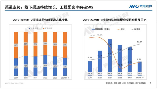 款式結構上看,全尺寸嵌入式仍是企業主推類型,份額持續擴張。奧維云網(AVC)監測數據顯示,2024年1-9月,全尺寸嵌入式洗碗機線上、線下市場份額分別為41%、78%,同比分別增長6和4個百分點。9月政策實施后,全尺寸嵌入式市場份額進一步實現擴張,雙線市場份額分別達到47%和80%。