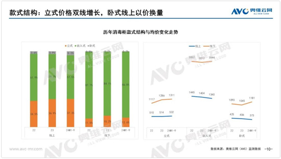 從款式結構看,嵌入式仍是主力款式,但長期看立式消毒柜的份額正逐漸擴張,奧維云網(AVC)監測數據顯示,2024年1-9月立式消毒柜線上、線下零售額份額分別為37.3%、12.6%,價格也在穩步提升。臥式消毒柜線上也出現明顯增長,主要原因是產品逐漸小型化面向小戶型人群,以及主打母嬰人群的專業小型產品拉動。