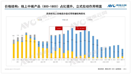從價格結構看,線上消毒柜中端產品增長明顯,奧維云網(AVC)監測數據顯示,2024年1-9月我國線上消毒柜800-1800價位段產品零售額份額為45%,較2023年全年提升3個百分點。增長一方面來自于立式產品升級帶來的結構增量,另一方面來自于線上嵌入式產品的價格下探。