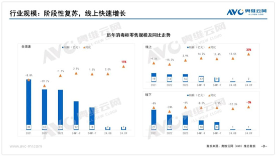 局部地區依舊換新政策品類增加涉及到消毒柜,對銷售拉動作用明顯,奧維云網(AVC)監測數據顯示,2024年9月我國線上消毒柜零售額同比增長33%。