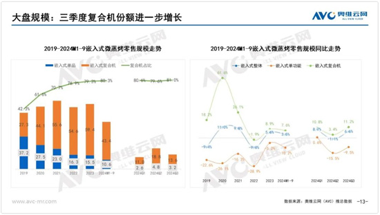 隨著用戶對于微、蒸、烤復合功能需求的持續提升,嵌入式復合機產品在市場的份額也持續走高。奧維云網(AVC)推總數據顯示,2024年1-9月,嵌入式復合機產品零售額占比為80.3%,較去年整體上漲1個百分點。