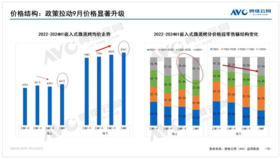 從價格結構看,以舊換新政策對9月市場的價格結構拉動明顯,均價整體呈上漲趨勢,結構上行。奧維云網(AVC)監測數據顯示,2024年9月,嵌入式微蒸烤線上市場6000元以上價格段零售額占比為33.1%,較去年增長5.9個百分點;嵌入式微蒸烤線下市場11000元以上價格段零售額占比為27.5%,較去年增長5.3個百分點。