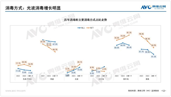 從消毒方式看,傳統的高溫、紫外線消毒仍是主要消毒方式。除此之外,光波消毒方式增長明顯,臭氧消毒方式雙線出現下滑。奧維云網(AVC)監測數據顯示,2024年1-9月我國線上線下光波消毒方式產品零售額占比分別提高6.0個百分點和9.9個百分點。臭氧消毒方式產品零售額占比線上線下分別下滑9.5個百分點和13.5個百分點。