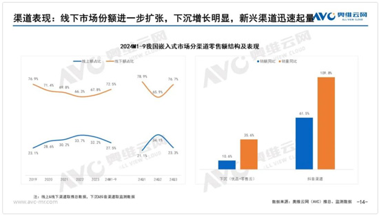 從渠道看,三季度以舊換新拉動嵌入式線下市場份額持續增長。奧維云網(AVC)監測數據顯示,2024年1-9月,嵌入式產品線下零售額占比為72.5%,較去年整體上漲4.7個百分點。同時,下沉渠道和抖音渠道的銷售也有明顯的上行趨勢。奧維云網(AVC)監測數據顯示,2024年1-9月,嵌入式產品下沉和抖音渠道零售額同比增速分別為10.6%、61.5%,市場依然廣闊。