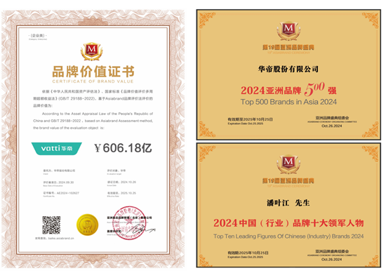 憑借在品牌力、智造力、渠道力等多方面的卓越表現,華帝品牌價值達到606.18億元,與華為、比亞迪、京東等同時上榜“2024亞洲品牌500強”。華帝股份董事長兼總裁潘葉江獲評“2024中國(行業)品牌十大領軍人物”。這一成績不僅是對華帝品牌價值和影響力的認可,也詮釋了中國廚電在亞洲乃至世界舞臺的品牌影響力。