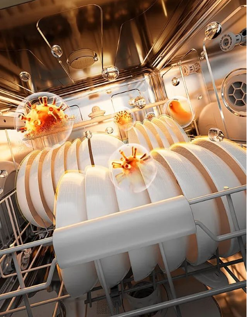采用全封閉式的洗滌,“PTC熱風循環+高溫烘干”技術,能快速且有效地烘干餐具上的水漬,避免細菌滋生。搭配雙風機環流干燥,有效排除濕氣異味,實現了“洗、烘、殺、抑、存”全方位的健康護航。