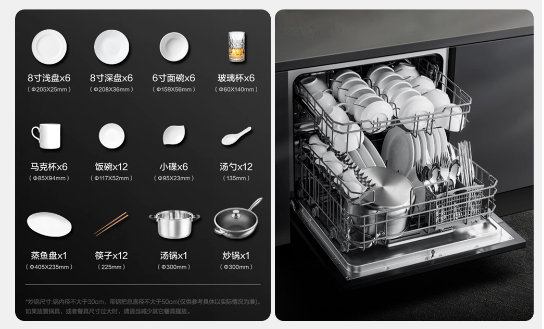 傳統洗碗水槽區域所占空間相對固定且較小,洗凈的餐具若不馬上收納,可能占據餐桌或其他空閑臺面空間,而且手洗時需要一個一個洗碗,用水量較大且不可控。