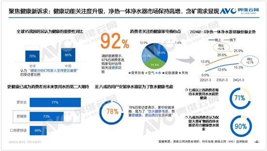 其次分享的是凈水行業(yè)的市場機會點,精準定位用戶需求,打磨產(chǎn)品,發(fā)展市場的新共識。田總指出,目前收入分層帶來了消費分級,已成基本面共識,但行業(yè)高端化主線和消費分級同步進行,對于凈水行業(yè)來說,在高端市場提供的不僅僅是高質(zhì)量的產(chǎn)品,更是從用戶的場景化需求出發(fā),搭建完整的飲水、用水解決方案,形成全屋凈水系統(tǒng),融入到家庭的各個場景中。
