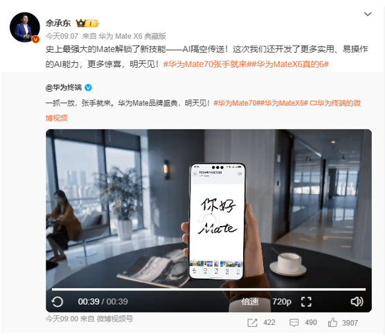 據(jù)悉,AI隔空傳送功能將適用于華為Mate70系列、Mate X6和華為MatePad Pro 13.2"2025款三款機(jī)型。