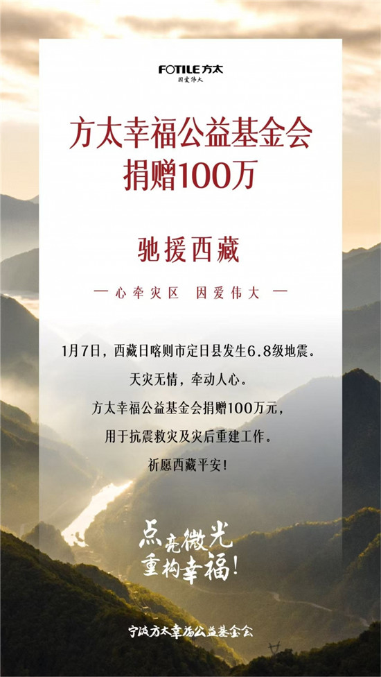 1月7日,西藏日喀則市定日縣發生6.8級地震,災情的發生牽動著全國人民的心臟。為幫助震區人民抗震救災以及進行災后重建工作,方太幸福公益基金會捐贈100萬元,馳援震區。