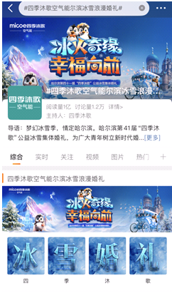 從2024年11月20日開始,四季沐歌簽約冠名公益冰雪集體婚禮并啟動征集,12月25日公示名單,1月6日舉辦集體婚禮,整個過程持續了接近50天,霸屏微博熱搜,公益冰雪集體婚禮全網曝光量已經超過1億次,四季沐歌空氣能又雙叒火爆出圈!