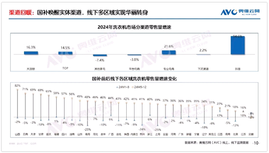 分渠道來看,線下渠道因資質審核更加直接、客單價更高和購物體驗更優質,因而在國補中獲益更多。根據奧維云網(AVC)數據,2024年1-8月線下KA/TOP/其它家電渠道洗衣機零售量同比分別+4.3%/-4.3%/-19.8%;而9-12月KA/TOP/其它家電渠道洗衣機零售量增速則達到31.9%/46.9%/17.2%。分區域來看,全國絕大多數省份國補后實現“華麗轉身”,以山西、云南為代表的8個省份國補后洗衣機零售量增速超50%,而國補前增速則為負數。此外,監測數據反映,經濟發達如北上廣蘇浙地區,其國補后增速均持平或低于全國平均水平,這或許表明在經濟較發達與欠發達地區,洗衣機換新的潛在規模更大,以舊換新政策效果更加顯著。