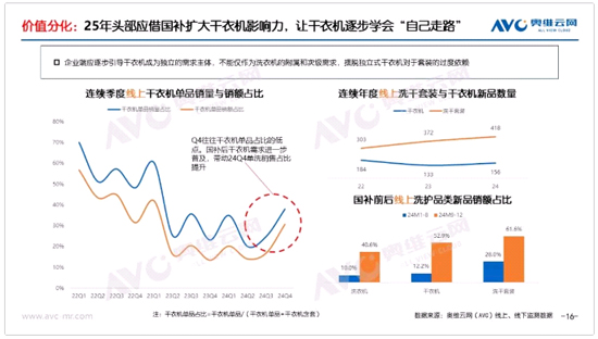 因而我們認為,企業應該借助國補這一契機,進一步深化對于干衣機的宣傳普及,讓干衣機真正學會“自己成長”,而不是淪為洗衣機的附屬需求,讓洗護產業未來能實現兩條腿走路。在國補中,我們也觀察到線上部分企業正積極引導消費者分開購買洗衣機與干衣機,數據體現干衣機單品占比在Q4顯著提升,這是讓干衣機獨立成長的良好信號。